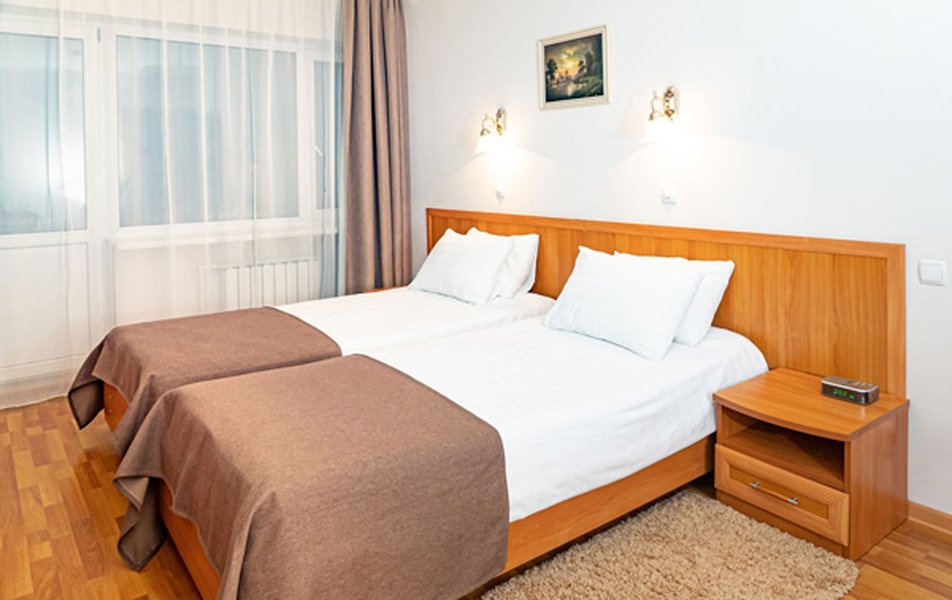 Оснащение две кровати с ортопедическим матрасом 90*200, электронный замок, кондиционер, телевизор, телефон, мини-холодильник, Wi-Fi, чайный набор, шкаф для одежды, вешалки, отопление, санузел с душем, фен